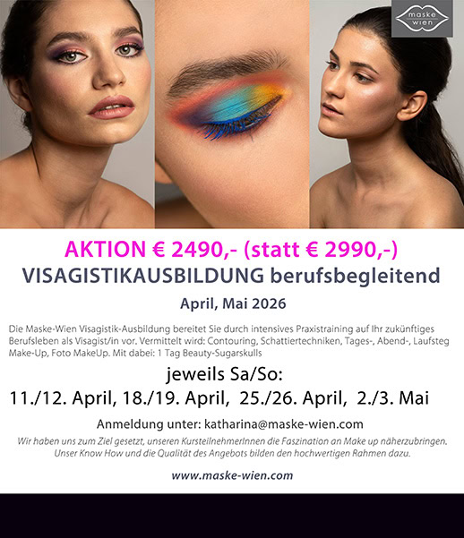 Maske-Wien – die Make up Ausbildung im Herzen Wiens. Unser Angebot wurde aus einer lebenslangen Leidenschaft für Make up und Maskenbild ins Leben gerufen: Wir bieten eine fachlich solide Ausbildung für all jene Interessierten, die den Beruf der Maskenbildnerin/ des Maskenbildners anstreben oder sich ergänzend darin weiterbilden möchten. Die Arbeitsbereiche eines Maskenbildners/einer Maskenbildnerin sind sehr vielfältig und spannend: Das Tätigkeitsfeld umschließt das Kreieren von unterschiedlichen Charakteren oder MakeUp Effekten für Theater und Film, Beauty-Make ups für Magazine und Werbung, Bodypaintings für verschiedene Events. Arbeitgeber unserer AbsolventInnen sind zum Beispiel.: ORF, ART4ART, Eurovision Songcontest, Salzburger Festspiele, Vereinigte Bühnen Wien, Staatsoper, Modeschule Hallein, Douglas, MAC, Bodyshop uvm.