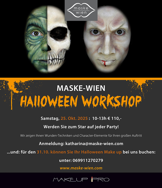 Maske-Wien – die Make up Ausbildung im Herzen Wiens. Unser Angebot wurde aus einer lebenslangen Leidenschaft für Make up und Maskenbild ins Leben gerufen: Wir bieten eine fachlich solide Ausbildung für all jene Interessierten, die den Beruf der Maskenbildnerin/ des Maskenbildners anstreben oder sich ergänzend darin weiterbilden möchten. Die Arbeitsbereiche eines Maskenbildners/einer Maskenbildnerin sind sehr vielfältig und spannend: Das Tätigkeitsfeld umschließt das Kreieren von unterschiedlichen Charakteren oder MakeUp Effekten für Theater und Film, Beauty-Make ups für Magazine und Werbung, Bodypaintings für verschiedene Events. Arbeitgeber unserer AbsolventInnen sind zum Beispiel.: ART4ART, Seefestspiele Mörbisch, Salzburger Festspiele, Vereinigte Bühnen Wien, Staatsoper, Modeschule Hallein, Douglas, MAC, Bodyshop uvm.